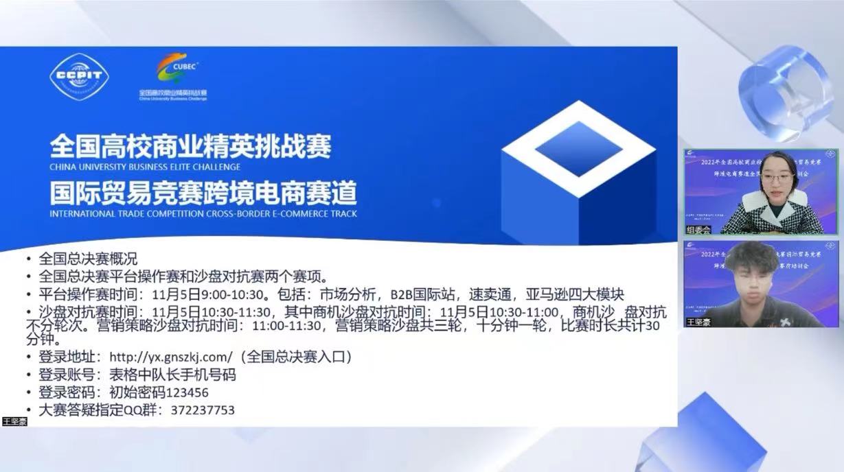 11月5—7日,由中国国际贸易促进委员会商业行业委员会、中国国际商会商业行业商会和中国商业经济学会主办,各省(自治区、直辖市)高校牵头承办的2022年全国高校商业精英挑战赛国际贸易竞赛跨境电商赛道全国总决赛在线上举办。经过层层选拔,687支参赛队伍3000余人参加全国总决赛。开云官网首次组织学生参加该项赛事,分别获总决赛一、二等奖,这是开云官网近年来在国家级学科竞赛中取得的又一次突破。