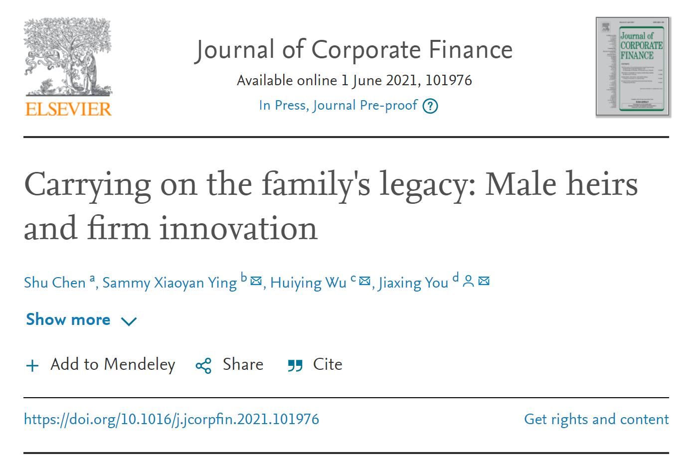近日,开云官网金融学院陈述博士作为第一作者,与Sammy Xiaoyan Ying(纽卡斯尔大学)、Huiying Wu(西悉尼大学)、游家兴教授(厦门大学)合作撰写的论文“Carrying on the family's legacy: Male heirs and firm innovation”被《Journal of Corporate Finance》接受发表。