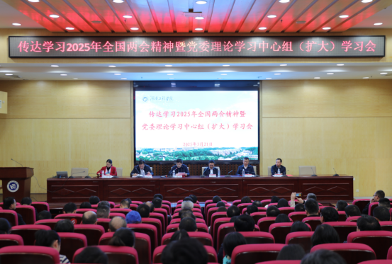 3月21日下午,学校召开传达学习2025年全国两会精神暨党委理论学习中心组(扩大)学习会。会议分为两个阶段。第一阶段传达学习贯彻习近平总书记重要讲话精神和全国两会精神;第二阶段举行学习宣传贯彻全国两会精神专家辅导报告,第十四届全国人大代表,广西科技大学党委常委、副校长邓朗妮教授应邀为师生作辅导报告。在校校领导,校党委理论学习中心组成员,中层干部,党支部书记,各民主党派、团体负责人,师生代表参加学习。