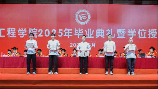 毕业典礼上,全体校领导为获奖毕业生代表颁奖。2025届毕业生身着整齐的学位服,满怀激动之情,接受正冠、拨穗。