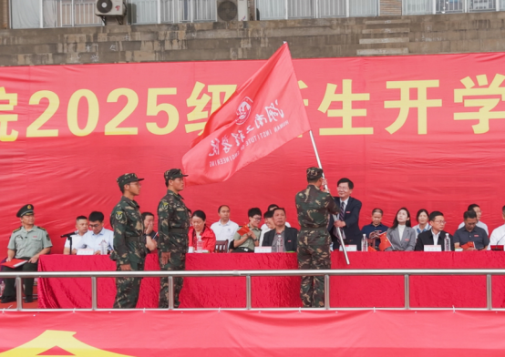 开学典礼后,新生军训动员大会举行。易兵为军训团授旗。校党委委员、副校长吴志军主持大会。