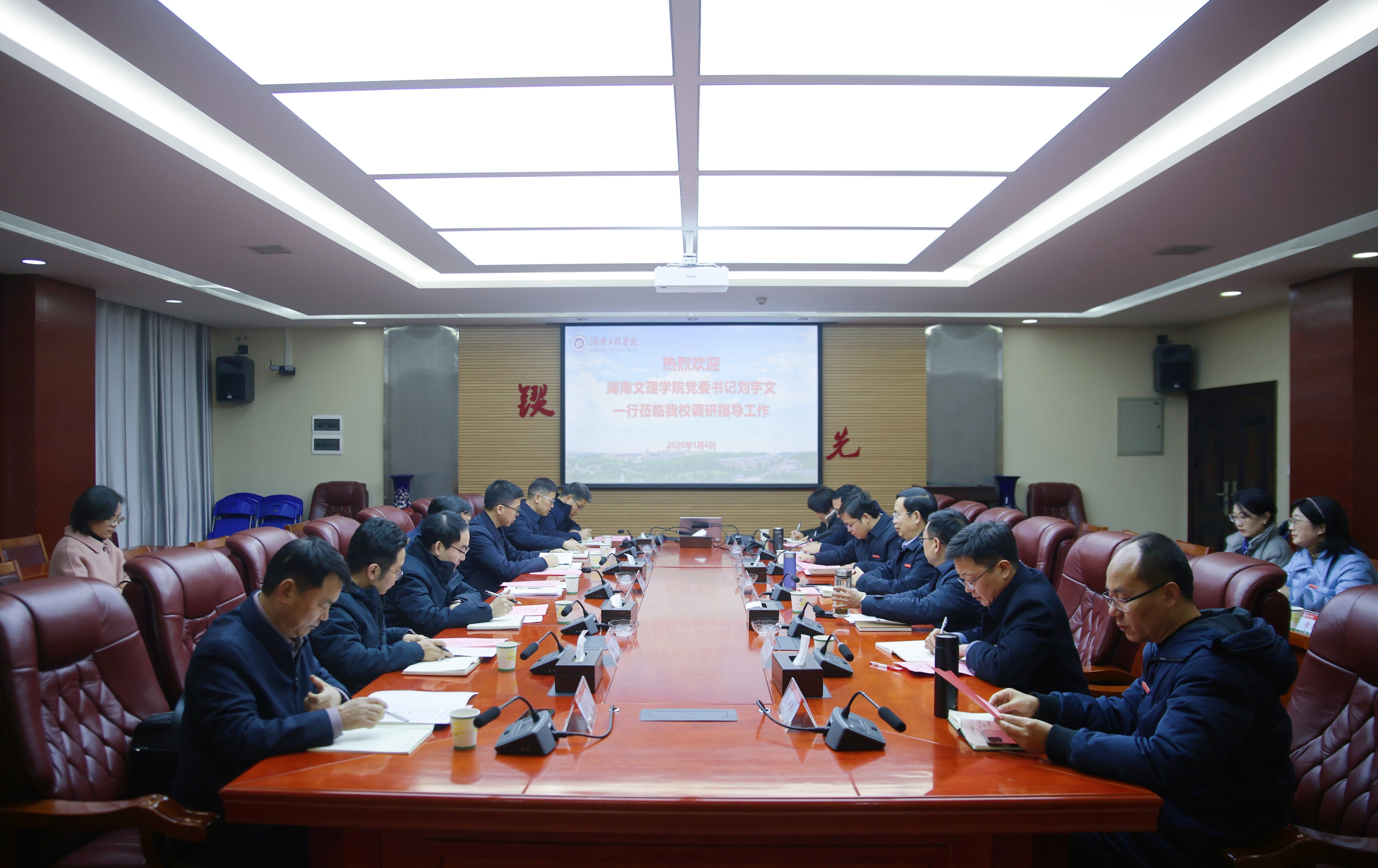 1月4日下午,湖南文理学院党委书记刘宇文,党委副书记、校长周智华,党委委员、副校长覃佐东一行来Beat365调研交流。座谈会在学校二会议室举行,Beat365党委书记黄昕,党委委员、副校长罗毅平,学术副校长丁选明参加。会议由丁选明主持。