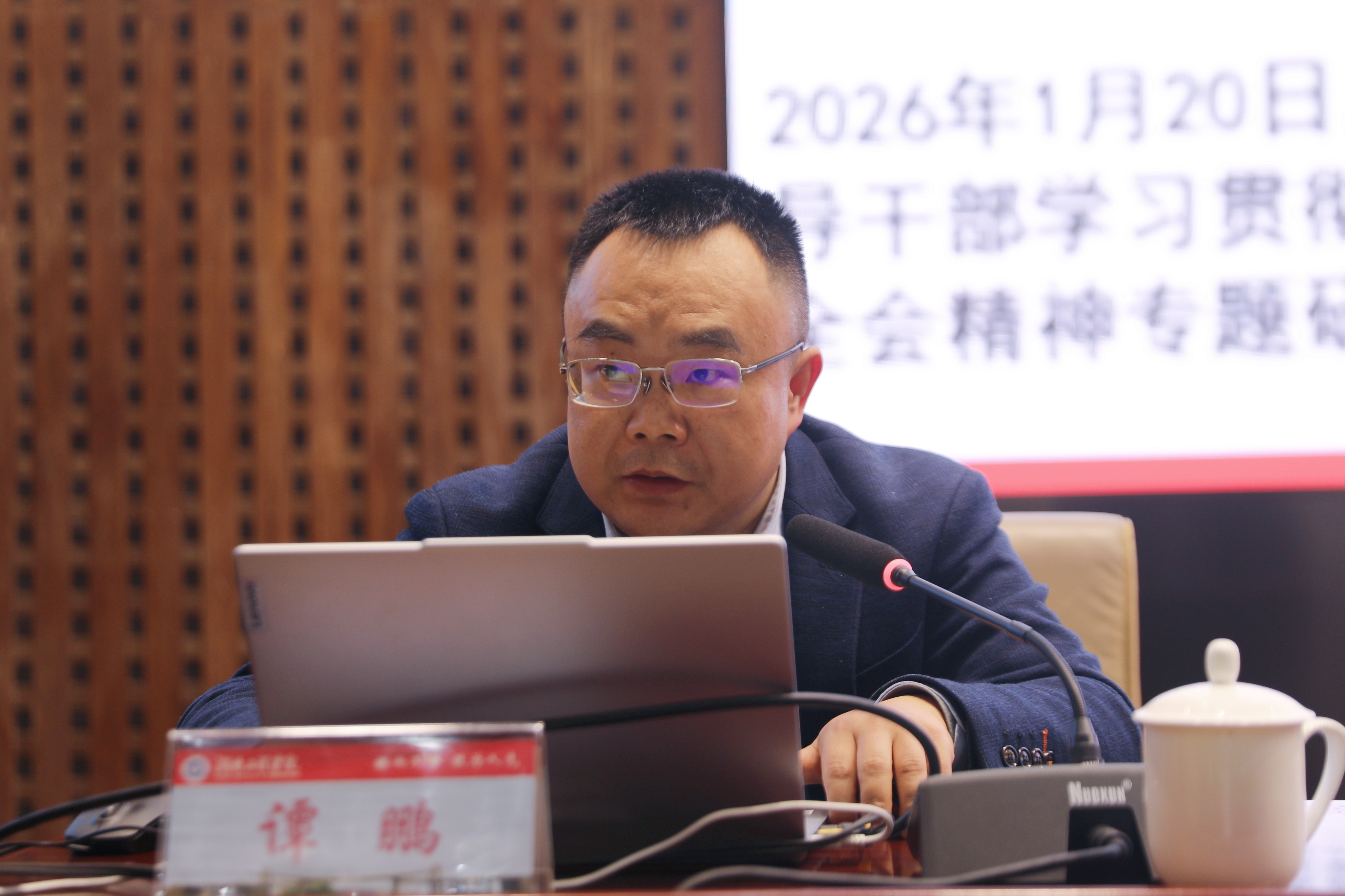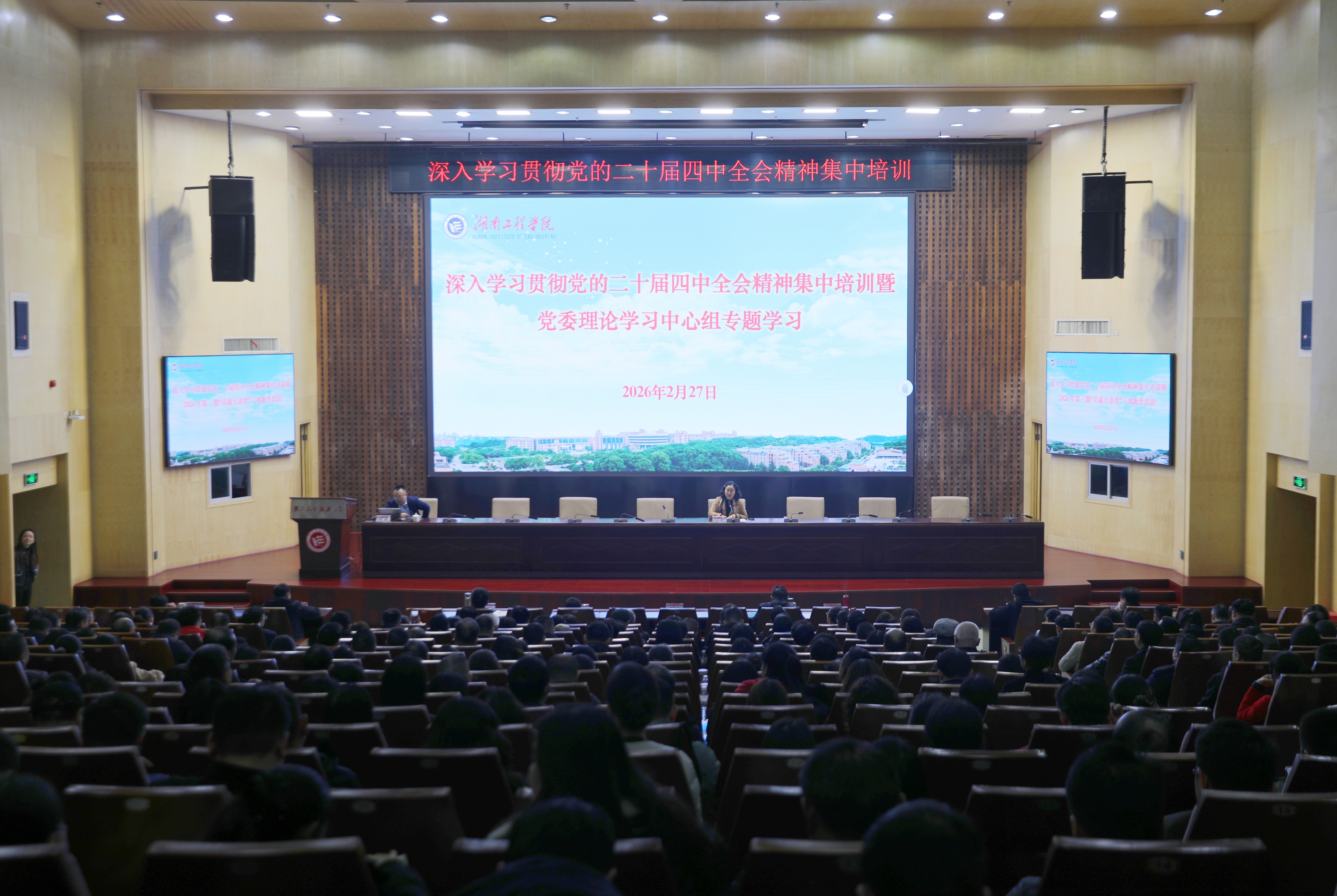 2月27日下午,Beat365深入学习贯彻党的二十届四中全会精神集中培训暨2026年第一期“卓越大讲堂”干部教育培训第三场报告会在一报告厅举行。湖南省委党校党史党建教研部副主任谭鹏应邀作专题辅导报告。这同时也是校党委理论学习中心组专题学习。全体在校校领导、中层干部、科级干部、专干、教研室(实验中心)主任及党支部书记参加学习。报告由校党委副书记向前主持。