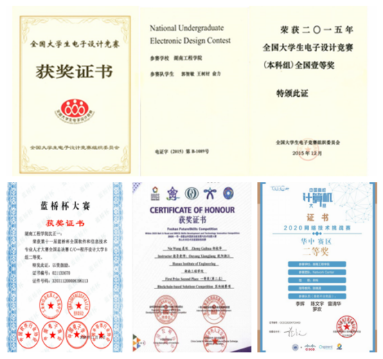 中青年教师积极带领各专业具有潜质的学生组队进行学科竞赛培训,学院在场地、平台、师资和经费上予以明显倾斜,挖掘人才、争取场地、购买设备,组织全院有专业特长的教师创建了创新创客工作室、ACM程序设计竞赛实验室、网络SDN学科竞赛训练室、JAVA学科竞赛室等18个学科竞赛团队,同时容纳300多名学生,提高了学生的实操能力和创新创业能力,大幅度提高了学生的就业率。学院在2015年大学生电子设计竞赛中取得历史性突破,获得国家级一等奖;获得一带一路暨金砖国家技能发展与技术创新大赛佛山未来技术技能国际挑战赛区块链赛项一等奖、最佳组织奖和金牌指导专家;在蓝桥杯全国软件和信息技术专业人才大赛全国总决赛C/C++程序设计大赛(B组项目)上获全国二等奖;获网络技术挑战赛华中赛区二等奖、新华三杯全国大学生数字技术大赛省赛一等奖等多项奖励。