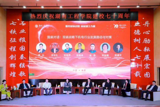 广东海洋投资管理有限公司董事长胡激涛,湘潭市科学技术局党组副书记,副局长金彪,哈电风能有限公司副总经理、总工程师宋晓萍,郑州华能电控设备有限公司总经理李金娥,深圳市盛弘电气股份有限公司副总经理肖学礼,智慧眼股份有限公司和北京老来网科技发展有限公司董事长邱建华,湘潭宏大真空技术股份有限公司总经理黄乐等7位嘉宾和校友,参加圆桌对话第一部分,探讨“双碳战略下机电行业发展路径与对策”。大家分别从湘潭市政府双碳建设及部署、机电产业投资、海上风电技术、电力系统、电源变换行业、人工智能技术、真空镀膜成套设备等方面,从不同的维度、高度和角度对机电行业进行了深度的交流,引起了现场观众极大兴趣,气氛热烈,发出阵阵掌声。