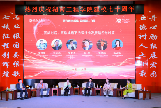 奥盛科技集团有限公司董事长彭煦,广州纤纬纺织品有限公司董事长,广东省服装协会副会长娄赛英,诸暨泰荣针织有限公司董事长刘训林,绍兴红锦天纺织品有限公司董事长龙德华,深圳市溥儿服饰有限公司董事长陈淑华等7位嘉宾和校友,参加圆桌对话第二部分,探讨“双碳战略下纺织行业发展路径与对策”。大家分别从湖南纺织服装行业、纺织行业在生态战略、能源结构、企业生产设备、珍珠纳米新材料、不同地域服装产业、出口贸易等方面,深度探讨了纺织行业的发展路径和对策,分享了个人的见解和经历。