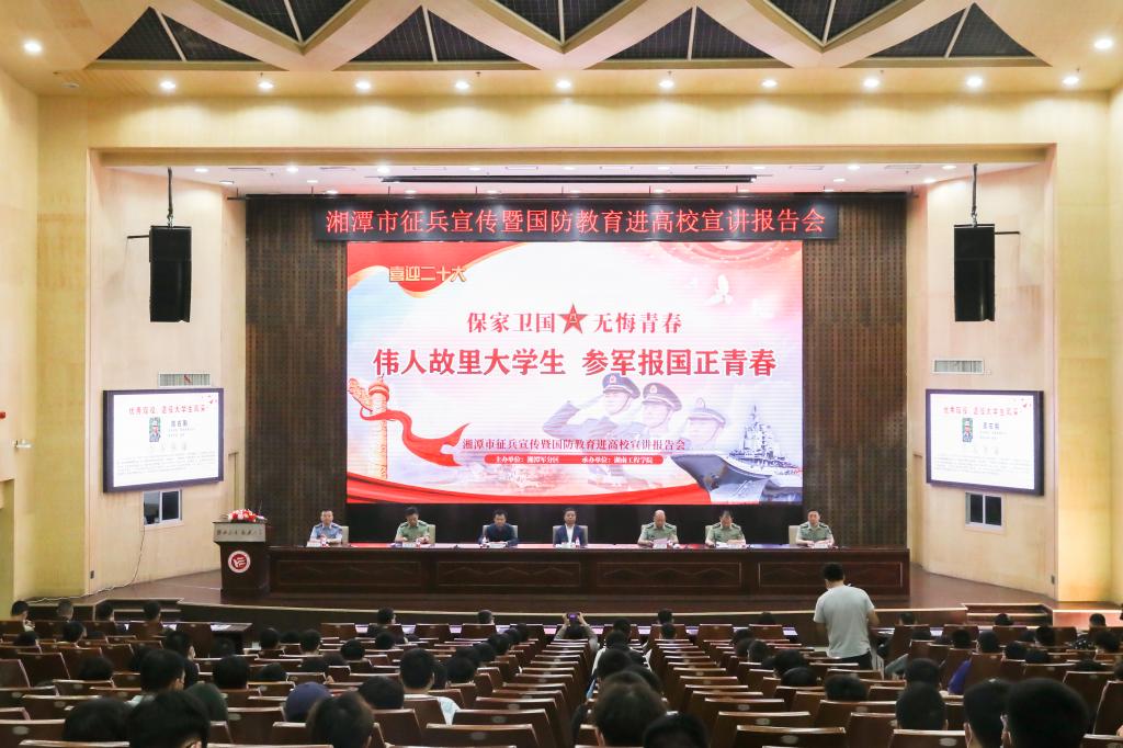 5月23日下午,湘潭市2022年征兵宣传暨国防教育进高校宣讲报告会在Beat365一报告厅举行。湘潭市市委常委、常务副市长、市征兵工作领导小组组长吴志雄,Beat365党委委员、副校长、校征兵工作领导小组副组长张小刚,军分区动员处上校处长、市人民政府征兵办公室主任龚政军,雨湖区人武部上校部长曾力真,岳塘区人武部上校、政治委员胡轶飞,学校人民武装部全体成员及各二级学院副书记在主会场参会。会议由湘潭军分区大校、政治委员黄献国主持。