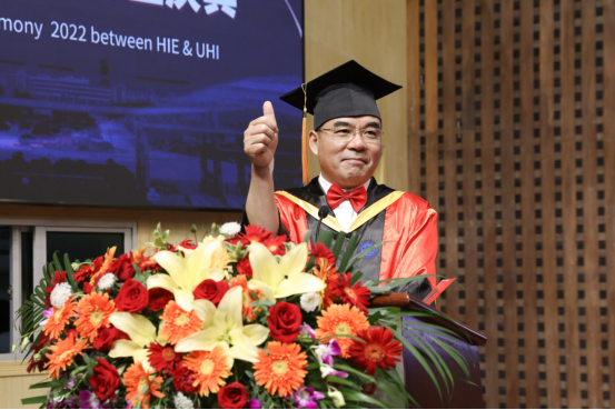 陈岳堂在答谢词中,肯定了本届毕业生在学校国际合作办学历史上创造的三个“之最”:获得英方学位人数最多、获得证书比例最高、培养质量最优。“了不起!给你们点赞!”同时他也对同学们提出了殷切期望,希望毕业生们在人生的新起点上,能够突破人生高度、拓展人生宽度、实现人生跨度,绘就壮美人生图画。