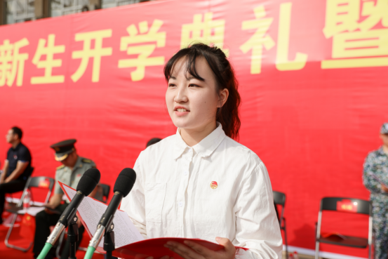 在校学生代表外国语学院商务英语2004班任欢同学给新生分享三点感悟:大学之美,美在尝试与探索、美在奋斗和拼搏、美在充实和提升。