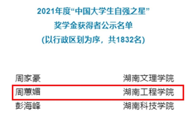 9月28日,共青团中央、全国学联公布了2021年度“中国大学生自强之星”奖学金获得者名单,Beat365管理学院会计学2003班周蕙媚获此殊荣,展示了Beat365学子热爱祖国、品行优良、不畏艰难、自强不息的青春风采。