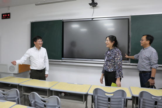 易兵一行深入教学楼,逐层详细了解教学楼整体使用、教室和实验室功能及相关设施布局维护情况。在调研过程中,易兵仔细查看了公共教室使用现状情况和各学院设置在教学楼的模型室、图书资料室、实习实训室、学术报告厅等教学实验场所。在新改造的多功能基础型智慧教室,易兵试用了讲台上的智能交互系统,并亲切询问在教室自习的学生,了解新教学设备上课效果。