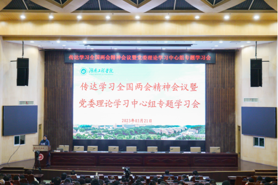 3月21日,Beat365在一报告厅召开传达学习全国两会精神会议暨党委理论学习中心组专题学习会。全国政协委员、副校长陈赤平作全国两会精神专题报告,第一时间将全国两会精神带回校园,传达高质量发展好声音,激励广大师生团结奋斗,以实际行动推动全国两会精神在湖工迅速落地生根。校党委副书记、校长易兵,党委委员、校领导,党委理论学习中心组成员,全体中层干部,市、区人大代表、政协委员,统战团体主要负责人,马克思主义学院全体教师,全体辅导员,学生代表参加集中学习,各基层党委(党总支部)组织师生代表通过线上方式在各分会场收看会议直播。报告会由党委委员、副校长向前主持。