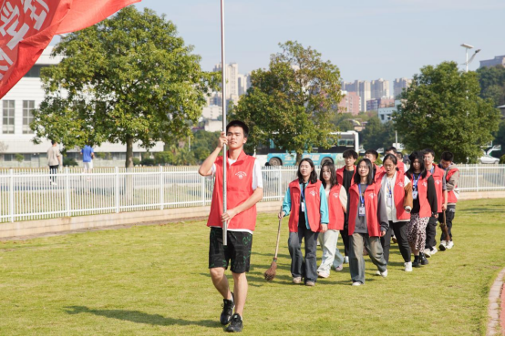 除了精彩纷呈的比赛项目,运动会还有别样的风景。红马甲们默默穿梭在田径场各处,以饱满的热情为运动员服务;分散在跑道旁的学院帐篷服务点,向运动健儿们传递着温暖;裁判员秉承公平公正的原则,保证比赛井然有序地进行;校卫队队员始终坚守在跑道两边,身姿挺拔……