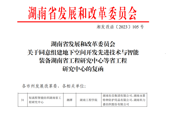 参与获批省级科研平台名单:湖南省低碳环保型电磁线研发及产业化应用创新联合体、湖南省球墨铸铁聚乙烯复合管工程技术研究中心、湖南省特种防护面料及防护服装工程技术研究中心、湖南省黄麻工程技术研究中心、湖南省通用惯性器件工程技术研究中心。