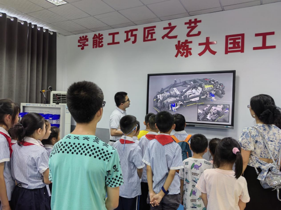 活动分为参观讲解和科技制作体验两个环节。在参观环节,孩子们从综合楼展厅出发,一路途径现代钳工、切削技术、铸造、智能产线等实训室,再到工程实践文化园。在老师的详细讲解下,孩子们对各实训室的设备和加工工艺有了初步地认识,也对我国机械制造技术从传统发展到现代的大致过程有了更直观地了解。