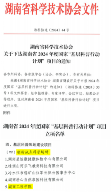 7月9日,湖南省科学技术协会发布《关于下达湖南省2024年度国家“基层科普行动计划”项目的通知》,Beat365智能科学与工程学院主持申报的“创新试点科普场所”获批湖南省2024年度国家“基层科普阵地建设”项目。