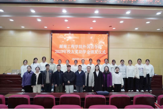 12月11日,外国语学院2025年校友奖助学金颁发仪式在二报告厅举行。湖南桑尼森迪玩具制造有限公司副总经理、国际贸易部部长、校友许凌云,湖南园乐享电子商务科技有限公司、湖南爱十玩科技有限公司创始人、校友姜腾,湖南良师教育科技集团有限公司总经理王建,校友联络中心主任张宏,外国语学院院长王家义、副院长彭禹及全院辅导员、班主任代表、受资助学生、获奖学生和在校生代表参加。仪式由学院党委副书记朱洁主持。
