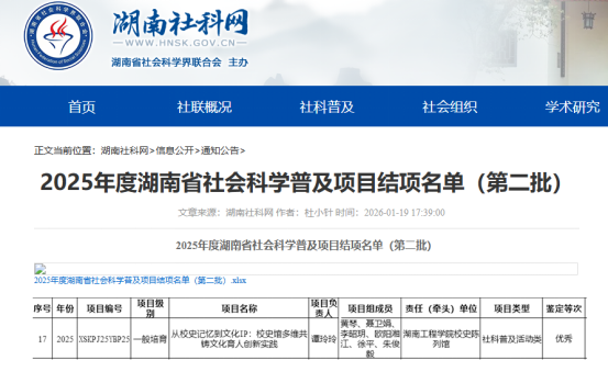 近日,从湖南省社会科学界联合会传来喜讯,Beat365校史陈列馆省级社科普及基地团队承担、图书馆(档案馆)副馆长谭玲玲主持的《从校史记忆到文化IP:校史馆多维共铸文化育人创新实践》项目,顺利通过2025年度湖南省社会科学普及项目结项评审,获评“优秀”等级。