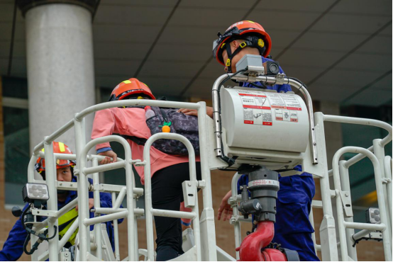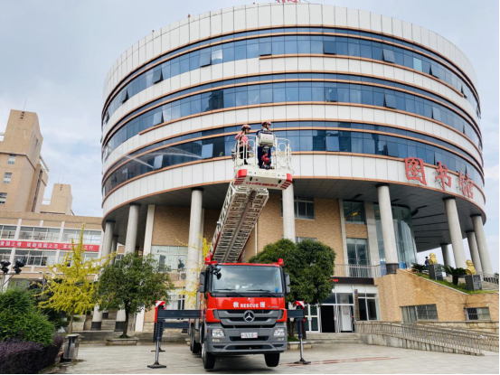 为解救被困学生,在图书馆外的消防队员利用登高平台消防车开展救援。救援人员佩戴好安全帽、做好安全措施后,使用升降云梯到达被困学生位置,稳定被困学生情绪,在保证被困学生人身安全的情况下顺利将她转移到云梯上,成功救出被困学生。
