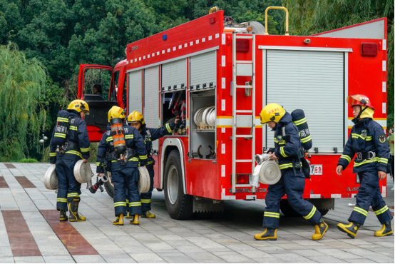 “呜……呜……呜……”两辆消防车驶入校园。扑救火情刻不容缓,消防队员迅速组织灭火行动,他们取出消防水带、灭火器等设备,赶往事发地点控制火势。队员们排成一排,在靠近火场的地方建立起了攻守防线,转眼之间,高压水流喷薄而出,“大火”被成功扑灭。