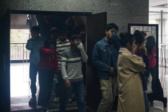 下午3点30分,校园拉响了消防警报,图书馆二楼过道上冒出了浓浓的白烟。负责组织楼道、楼梯等位置疏散的老师迅速进行人员疏导,全体学生双手抱头、弯腰低胸,在疏散引导员的指挥下,安全、有序撤离图书馆,跑到楼下安全地带。通过清点人数,发现有一名学生被困在二楼。
