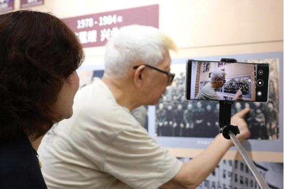 一幅幅生动的历史图片,一件件泛黄的历史资料和斑驳的实物,勾起老同志对峥嵘岁月的无限回忆。“你看你看,这个是我,这个是你……”他们有的戴着老花镜,俯下身子细细查看,在照片上仔细寻找着他们和学生“年轻时的模样”,回忆“曾经的岁月”,分享着仍记忆犹新的人和事;有的拿出手机,把展馆内的内容一一录下、拍下,留作以后慢慢体味;有的请人替自己在馆内拍照留念,要把这一切与曾经的青春岁月永留心中。