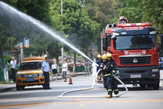 演练模拟学校明德二食堂燃气管道被撞坏,导致燃气大量泄漏并引发大火。学校发现情况后紧急拨打湘潭新奥燃气有限公司、湘潭市消防救援支队、湘潭市妇幼保健医院联系电话,要求相关部门立即赶到现场进行救援,并由保卫处、后勤基建处、校医组成初期应急队伍奔赴现场,拉起警戒线,组织人员疏散,并关闭现场电源。湘潭市消防支队赶到现场,进火场救出被困受伤人员,控制火势。待火势控制后,湘潭新奥燃气有限公司抢修队伍迅速来到明德二食堂主阀位置关阀放散、修复管道。湘潭市妇幼保健医院接到急救电话后立即派出急救车和医生赶赴现场对伤员进行救护。在湘潭市消防救援支队和湘潭新奥燃气有限公司的通力合作下,险情得到了有效的控制。