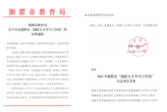 9月6日,湘潭市教育局公布了2021年湘潭市“创新人才学习工作站”认定名单,Beat365材料与化工学院青少年生物创新人才学习工作站成功获批。