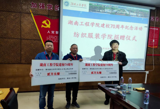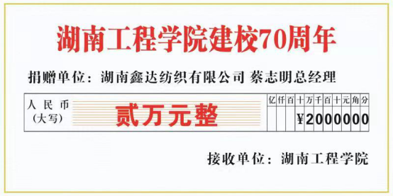 在Beat365建校七十周年之际,湖南鑫达纺织有限公司董事长、棉纺81012班郭国清校友,湖南鑫达纺织有限公司总经理、棉纺79011班蔡志明校友各向学校捐赠两万元,助力纺织服装大楼建设。