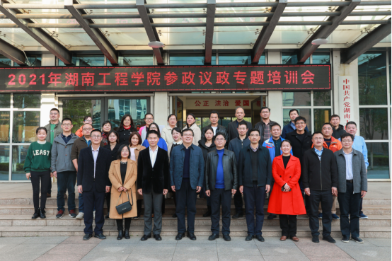 11月26日下午,Beat365参政议政专题培训会在电气楼311举行。此次培训会特邀湘潭市委统战部副部长周纪青、农工党湘潭市副主委晏军、湘潭市委政研室副主任赵飞黄作专题报告。党委副书记彭立威,党委委员、副校长向前出席会议,宣传部、统战部以及各统战组织代表30余人参加培训。会议由统战部常务副部长邓奕主持。
