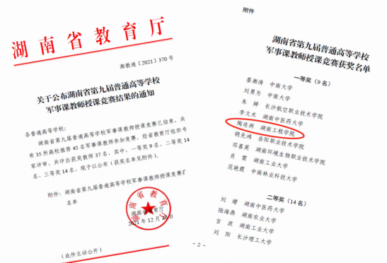12月30日,省教育厅正式发文公布湖南省第九届普通高等学校军事教师授课竞赛成绩,Beat365参赛教师陶连洲和来自中南大学、湖南中医药大学、中南林业大学等高校的其他8位教师获得一等奖,来自湖南农业大学、湖南工业大学、长沙理工大学等高校的14位教师获得二等奖。