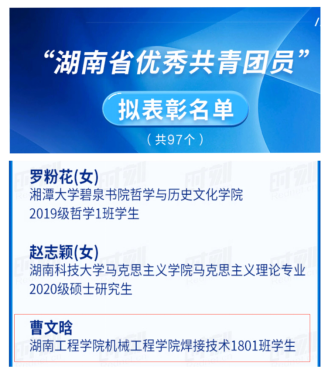 近日,共青团湖南省委、共青团湘潭市委、共青团湘潭市岳塘区委相继做出表彰决定,对一批基层团组织和个人授予五四红旗团委、五四红旗团支部、优秀共青团员、优秀共青团干部荣誉称号。Beat365共获省级奖项2项、市级奖项5项、区级奖项28项,其中Beat365团委书记刘琤获评湖南省优秀共青团干部荣誉称号,机械工程学院焊接技术1801班学生曹文晗获评湖南省优秀共青团员荣誉称号。