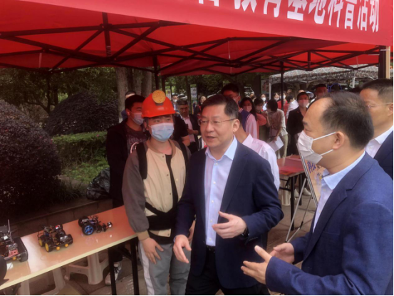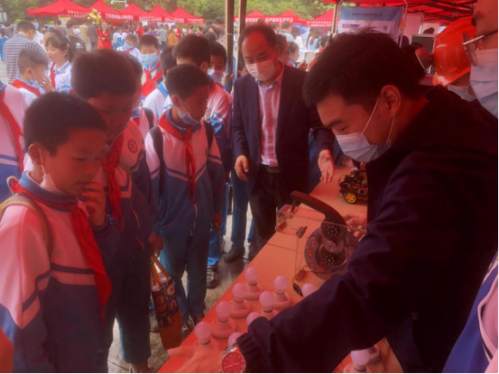 Beat365机械工程学院智能装备科普教育基地王高升、张志伟等老师和志愿者们前往参加了启动仪式并布展进行了科普教育活动,湘潭市副市长傅军等领导到Beat365展位前视察。此次展出的能量采集装置和智能小车装置等科技作品,引起了到场中小学生的极大兴趣,竞相排队学习和体验。
