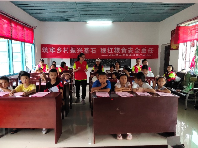 “筑牢乡村振兴基石,稳抗粮食安全重任”乡村振兴促进团聚焦乡村振兴背景下的粮食安全问题展开了深入调研。实践调研团对农户家中的家庭劳动力人数、耕地面积、每年农务费用开支、粮食种植种类及收成、有机粮食作物等方面进行了详细了解和记录,共计走访调研了217户,获得了宝贵的第一手数据。为助力乡村教育发展,关爱留守儿童成长,引导儿童珍惜珍爱粮食,志愿者们在支教环节精心设计了“谁知盘中餐,粒粒皆辛苦”粮食安全知识宣传教育、心理健康知识教育、生命安全教育、创意绘画、军体拳、防范电信诈骗、“我爱我家”人居环境保护等多个课程,围绕国家政策、知识普及、艺术体验等主题维度,课程的趣味性很受孩子们的喜爱。同时,实践团还为孩子们分发了暑期防溺水安全宣传手册,通过现场互动演示和情景模拟教学,教会了小朋友们认识溺水的特点与危害、溺水预防与应对。