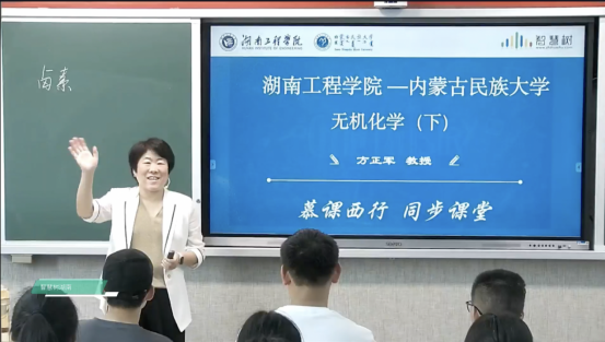 启动仪式后,Beat365唯一官方网站国家级一流本科课程负责人、湖南省教学能手、湖南省课程思政教学名师方正军教授在A502智慧教室,通过智慧树的跨校直播互动网,开启了与内蒙古民族大学学子们的《无机化学》课堂云同步,两校学子线上同步学习了“卤素”相关课程内容。方正军针对同步课堂特点,结合两校学生专业特色以及课程学习内容,精心梳理教学内容、认真打磨课件。在课堂上,她针对卤族元素通性、卤族单质、卤化氢和氢卤酸、卤化物、氯的含氧酸及其盐等五个方面的内容进行了深入浅出地讲解,生动有趣的课堂得到了两校学子的肯定与喜爱,取得了很好的教学效果。
