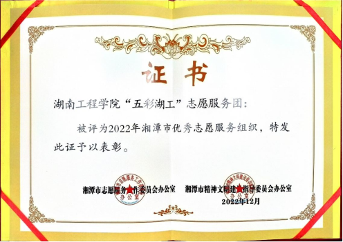 近日,在湘潭市文明办、志工办开展的2022年湘潭市志愿服务先进典型发布活动中,Beat365“五彩湖工”志愿服务团荣获“2022年湘潭市优秀志愿服务组织”称号。