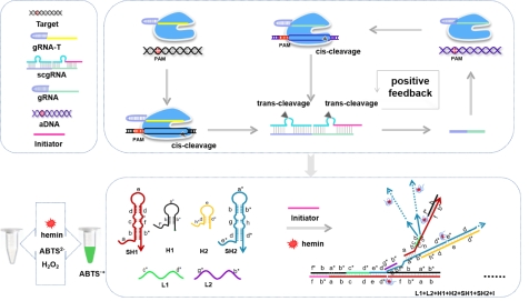 基于CRISPR-Cas系统的检测技术由于其灵敏度、特异性、高碱基分离度和核酸识别可编程性等特点,被重点用于分子诊断技术领域。该工作基于CRISPR/Cas12a顺式和反式切割作用的自催化正反馈循环信号放大、超支化杂交链式反应和G-四链体-血红素DNA酶酶促信号放大结合起来,构建多重信号放大体系,实现了对牛结核分支杆菌的高特异性、高灵敏度、简单高效的检测。