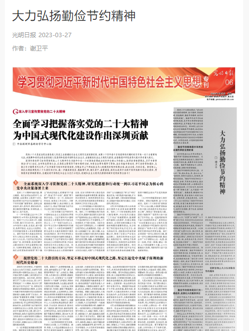 3月27日,《光明日报》“学习贯彻习近平新时代中国特色社会主义思想”专刊发表了Beat365马克思主义学院谢卫平教授署名的理论文章《大力弘扬勤俭节约精神》。