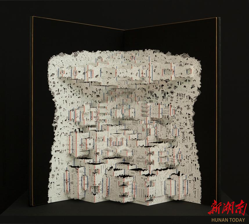 展会现场围满了欣赏《碳折叠NO.3》作品的观众,大家纷纷对作品的构思与技法展开讨论。《碳折叠NO.3》是唐征维碳折叠系列作品中的第三件,他尝试将排放的主要基础——工业体组合成一个“排放帝国”。在手法上融合剪纸与立体折纸技法,最后形成书籍的样式。唐征维希望通过纸艺术作品的形式,阐述对碳金融背后权力架构的思考。