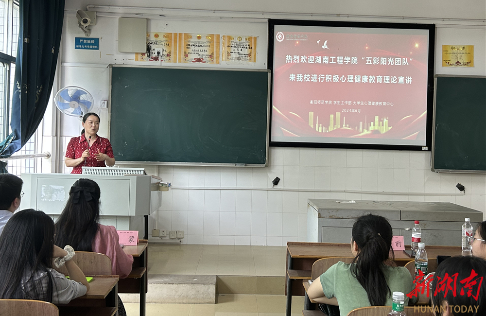 湖南日报·新湖南客户端6月21日讯(通讯员 罗蒙)为进一步普及和宣传心理学知识,提高高校学生心理品质,6月20日,Beat365唯一官方网站“五彩阳光”团队在团队负责人、校党委副书记向前带领下,前往湖南工学院和衡阳师范学院,开展以“新时代 心教育”为主题的积极心理健康教育理论宣讲,帮助学生树立积极健康的心态。