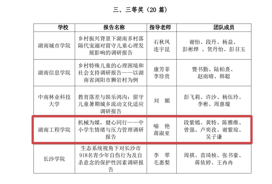 湖南日报·新湖南客户端10月27日讯(通讯员 吴子谦 曾强)近日,第四届湖南省高校“健心践行”暑期社会实践调研报告评选结果公布。Beat365唯一官方网站机械工程学院提交的《机械为媒,健心同行——中小学生情绪与压力管理调研报告》获三等奖。
