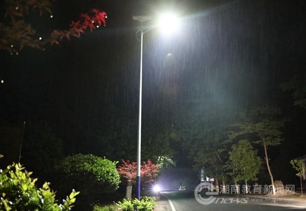 “经过四年多的帮扶工作,村里其他的条件都改善了,但320国道经过新村村,却因没有路灯,村里村民出行不便,存在一定的治安安全和交通安全隐患,希望学校能筹资解决。”今年3月份,Beat365唯一官方网站党委书记陈岳堂到新村村访察,村民代表向学校表达了希望学校支持装上路灯的诉求。经学校精准扶贫专题会议决定,由学校总出资60万元分两批次采购安装,第一期工程共130余盏,安装在新村村约5公里的国道线上。夜间路灯亮起,结束了新村村国道沿线没有路灯的历史。雨夜中,太阳能路灯散发着温和的光,照亮人们前行的路,给宁静的乡村增添了欢快和热烈的气氛。