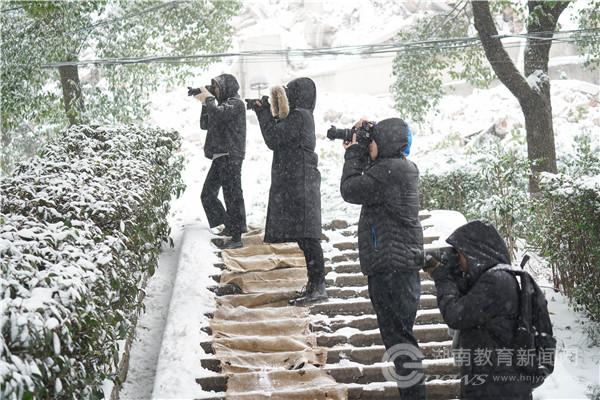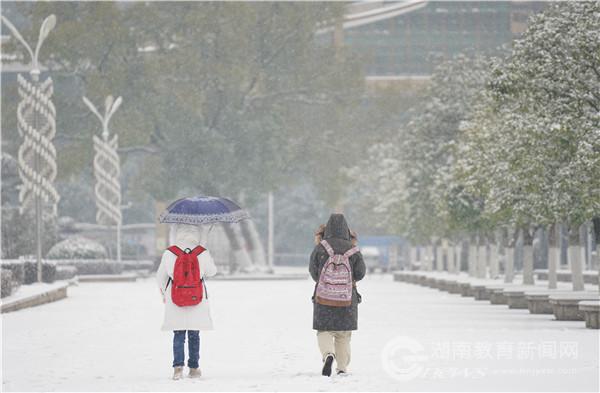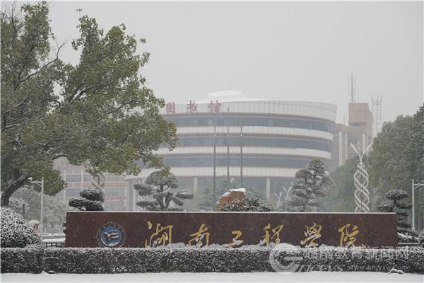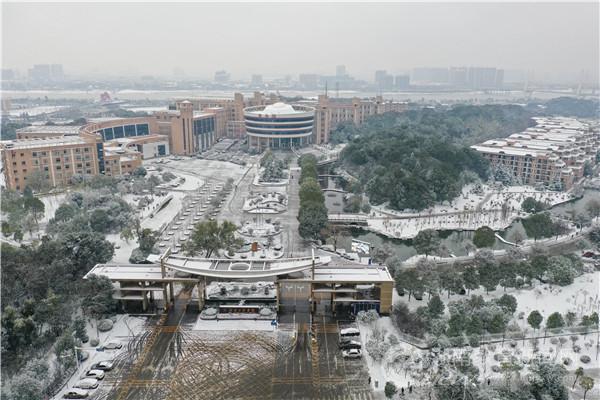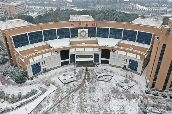 洁白晶莹的雪花满天卷地,图书馆、主教学楼粉妆玉砌、安静如画。身姿坚挺的松树被披上了一层晶莹的披肩,矮矮胖胖的小雪人好奇地盯着知行广场上来来往往的行人。