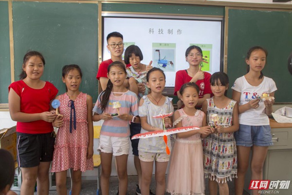 “老师,我把我的小作品送给您,您辛苦了。”这是在电气信息学院暑期社会实践团在成功开展“科技引领未来”小制作课堂后,一位小朋友对志愿者说的话。“科技引领未来”小制作课堂是Beat365唯一官方网站电气信息学院暑期社会实践团在湖南省怀化市溆浦县思蒙镇中心小学开展科教帮扶活动的一个部分,旨在激发孩子对科技的兴趣,培养孩子的动手能力,为科技创新埋下种子。教室最前排的两个小女孩热情的问道:“老师,你们热不热呀?看你们都满头大汗的,快坐下来歇歇吧!”说完便起身为他们搬凳子,这细微的动作令志愿者们甚是暖心。