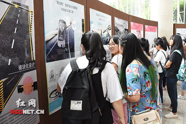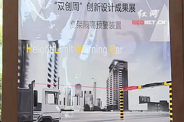 “通过高架限高预警装置探测汽车的高度,提醒驾驶员能否通过限高杆。”在逸夫楼大厅,湘潭大学机械工程学院的大三学生袁舒琪向记者介绍。在现场,有20多个展板展示着同学们关于工业设计系关于航天领域、智慧城市、智能家居等方面的创新成果。