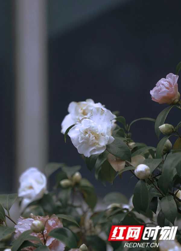 粉白相间的山茶花,褪去雨的痕迹,如玉雕般久盛在春寒料峭里。