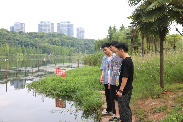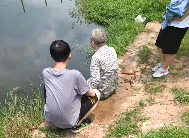 时值正午,烈日炎炎,人烟稀少。刚参加完学校活动的刘毅和曾浩恰好路过木鱼湖桥,听见了咳嗽声和敲打水面的扑通声。“我们迅速冲到湖边,发现水面没有人,只有一根拐杖在水里上下击打。”刘毅称,当时他们都推测应该是有人落水了,便将身上手机往草丛里一抛,先后迅速跳入水中救人。