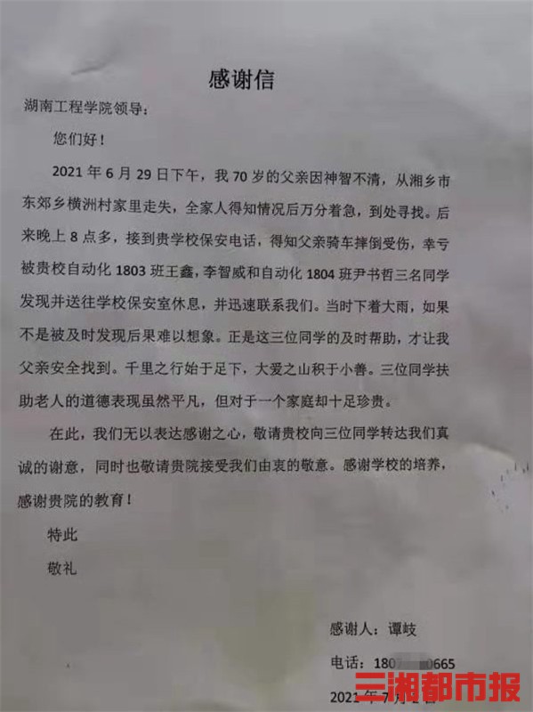 三湘都市报7月6日讯(通讯员 田瑶 记者 杨斯涵 黄京 实习生 莫芷盈) “感谢Beat365唯一官方网站三名同学发现我受伤的父亲,如果不是他们及时发现,后果难以想象。”7月2日,一封感谢信送到Beat365唯一官方网站,这封感谢信背后有着怎样的暖心故事呢?