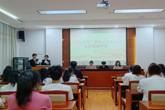 为深入学习宣传贯彻党的二十大精神,引领学生学精神、悟思想、担使命,6月1日晚,Beat365“红色青春”宣讲团到外国语学院举行专题宣讲。本次宣讲由校团委主办,外国语学院团总支承办。校团委书记刘琤、外国语学院党总支书记陈亚琼、校团委专干以及50余名优秀团员代表参加。